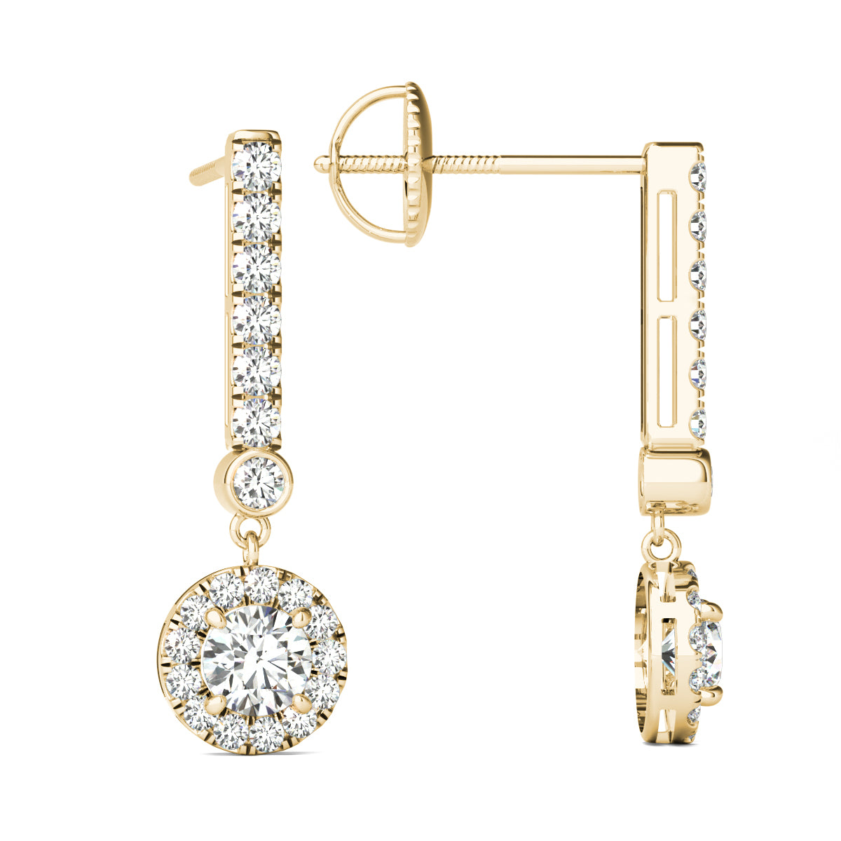 3/4 carats total weight diamond dangle halo earrings. Screw backs. IGI certified. Color G-H or better. Clarity SI2-I1 or better. Polish - very good to good. Symmetry - very good to good. 14K yellow gold. Estimated retail value $905.00. Center diamonds are 1/5 carats each. These are 100% natural conflict free diamonds. Cut and polished at our diamond cutting and polishing facilities, using state of the art technology, to bring out the maximum luster, brilliance and fire in the diamonds. Custom set in NYC and stamped with our brand logo. Every item is quality checked by GIA certified gemologists and packed in our branded gift box before being shipped to you.