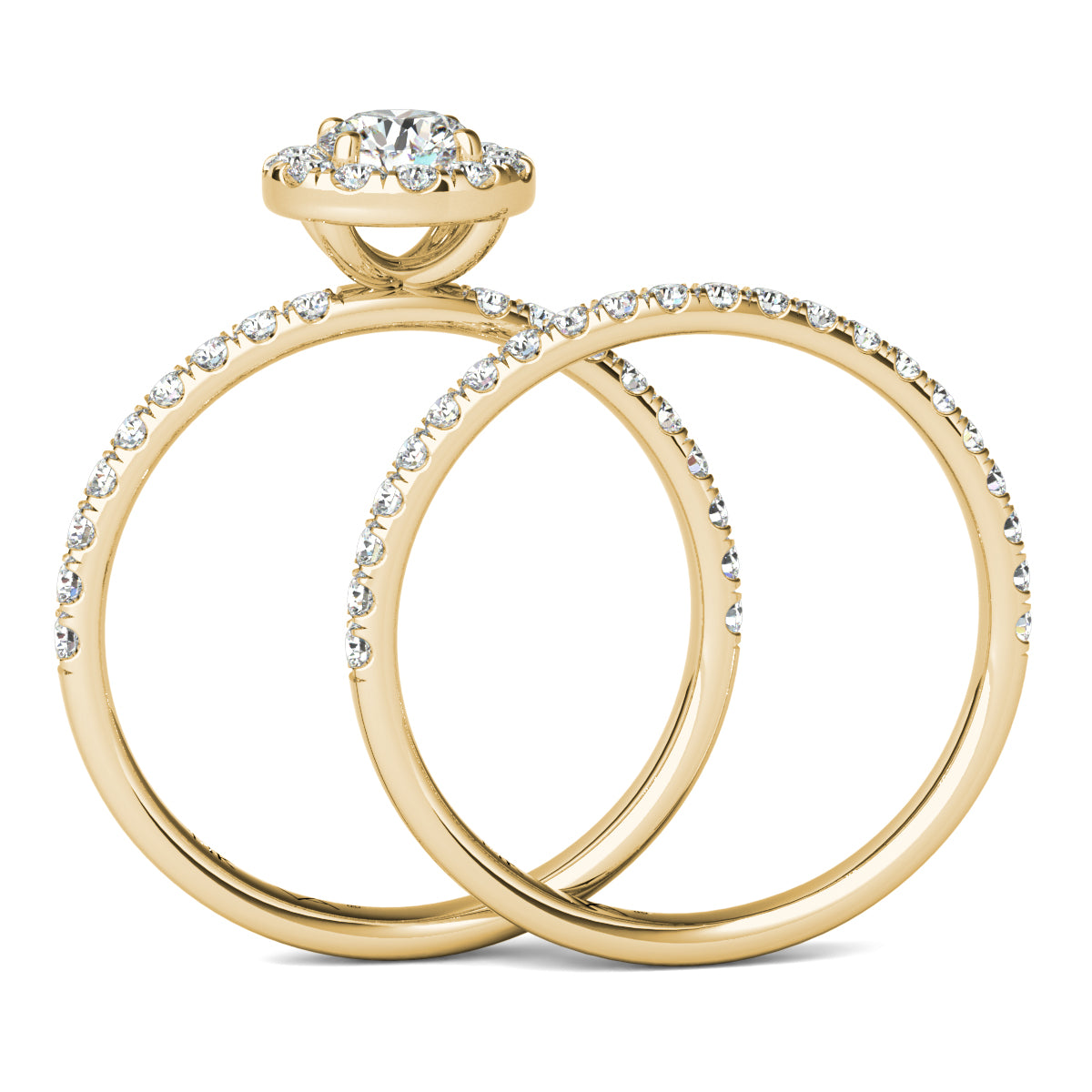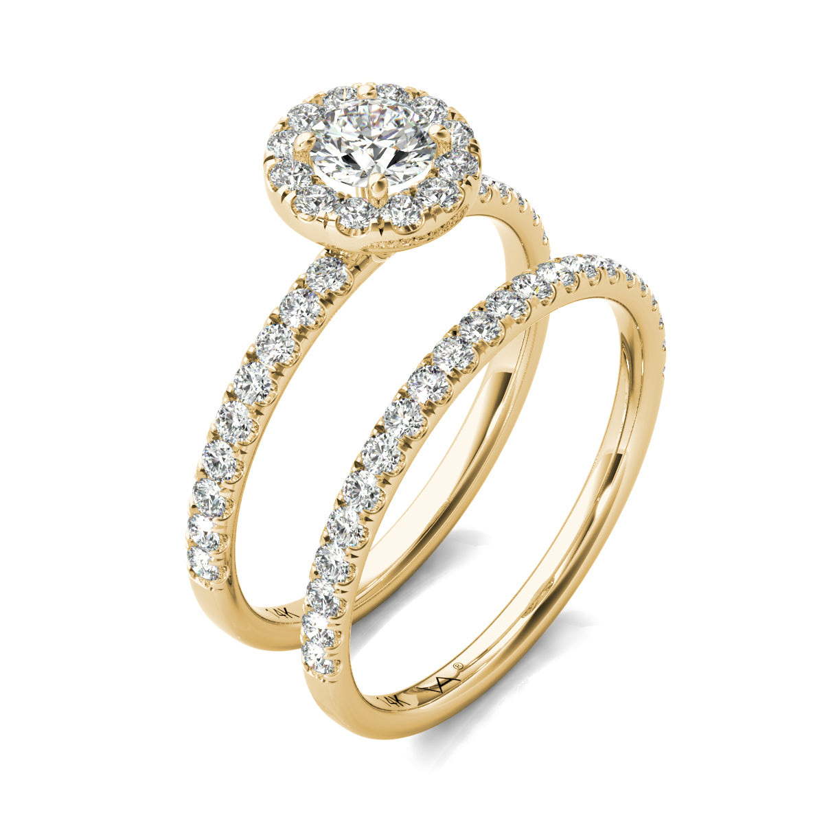 Halo is row of smaller diamonds that "halo" or surround a larger diamond. Double halo is two rows of diamonds surrounding a larger diamond.