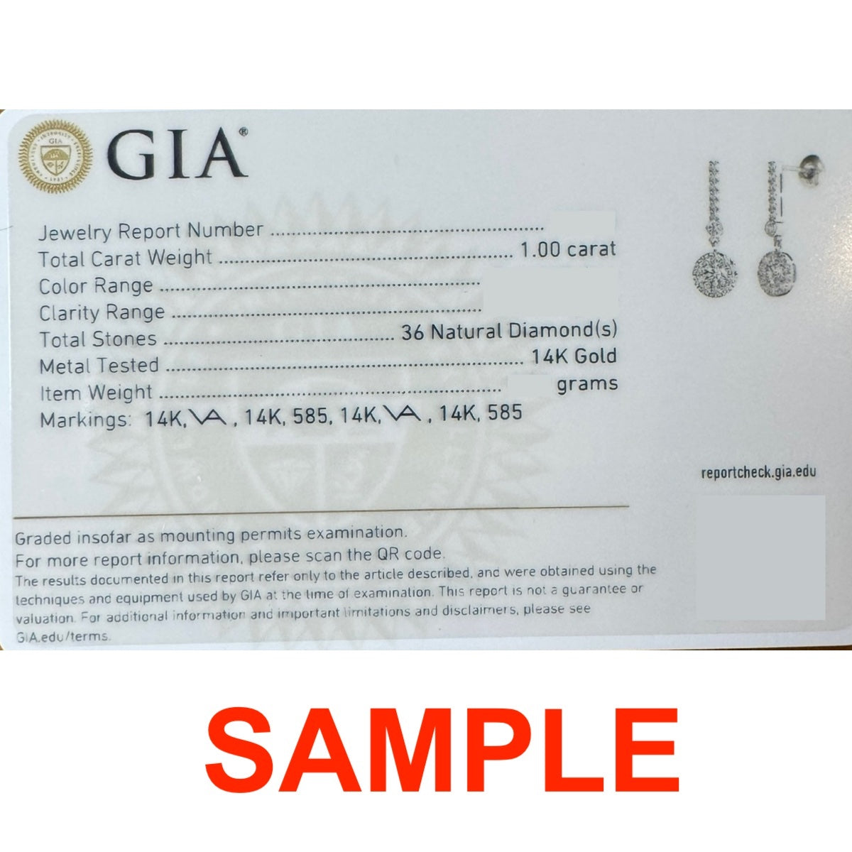 1.00 carats total weight diamond dangle halo earrings. Screw backs. GIA certified. Polish - very good to good. Symmetry - very good to good. 14K white gold. Estimated retail value $2499.00. Center diamonds are 1/5 carats each. These are 100% natural conflict free diamonds. Cut and polished at our diamond cutting and polishing facilities, using state of the art technology, to bring out the maximum luster, brilliance and fire in the diamonds. Custom set in NYC and stamped with our brand logo. Every item is quality checked by GIA certified gemologists and packed in our branded gift box before being shipped to you.